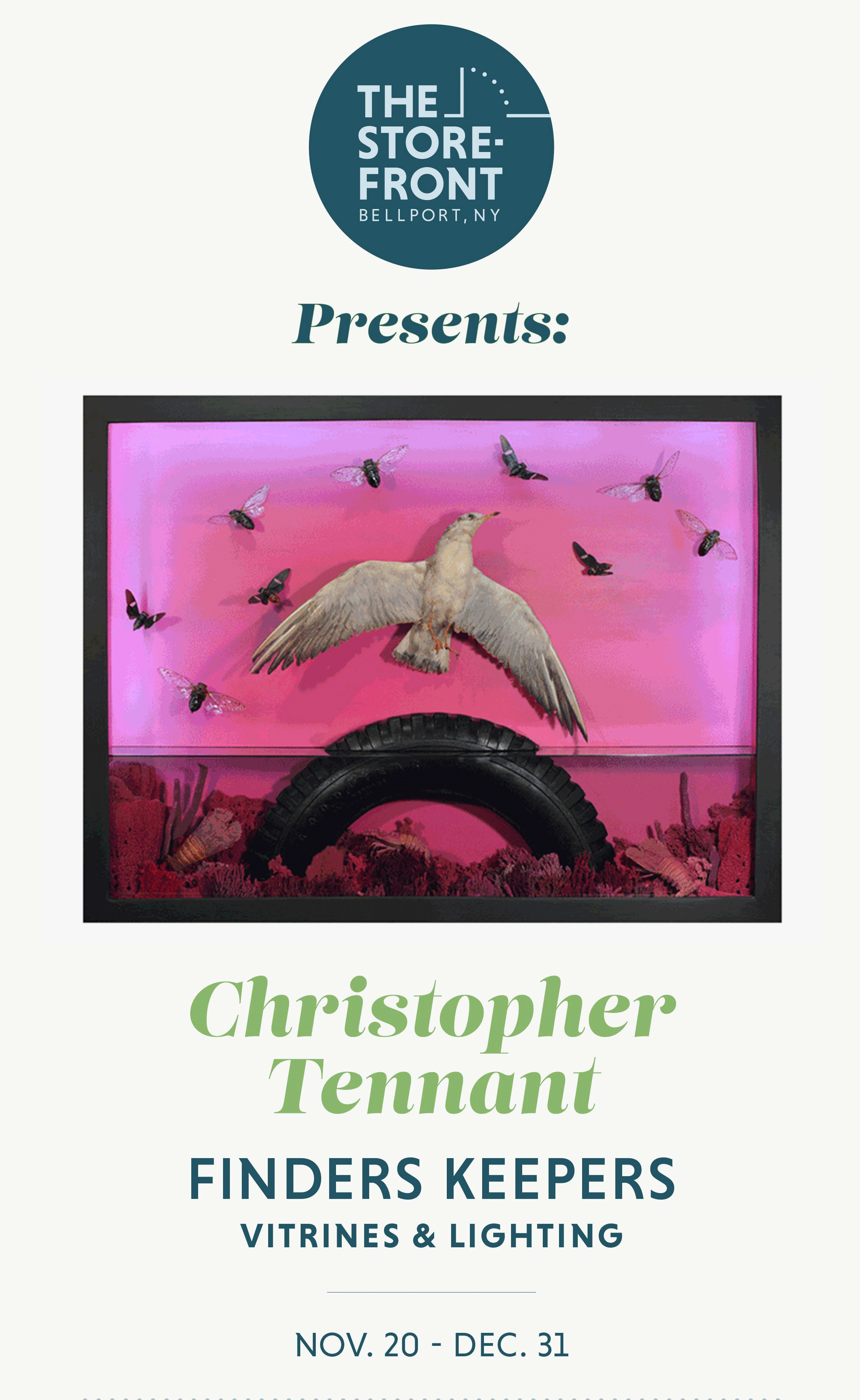 Christopher Tennant’s illuminated vitrines and cases have been featured in the Wall Street Journal, W magazine, and New York magazine, among other publications. Influenced by the ecological beauty of the Bellport-Brookhaven area, where the artist has resided for over 15 years, his pieces are assembled from vintage and found materials to capture intimate moments from the natural world that may have never happened. Though his work has been the subject of several solo exhibitions, he has never shown in Bellport. Fittingly, his inaugural showing in his adopted hometown includes a new collection of decorative lamps inspired by the cosmopolitan creative energy that radiated from Brookhaven Hamlet throughout the 1920s and early 1930s.